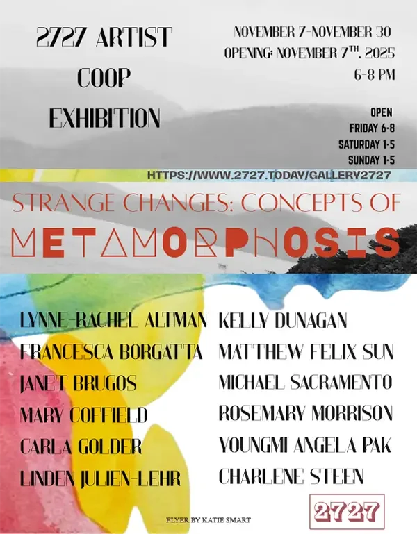 In Strange Changes, the artists of Gallery 2727 explore the idea of metamorphosis in many different guises through sculpture, painting, textiles, and collaborative work. Through a unique blend of media, the artists in this exhibition invite viewers to contemplate the multifaceted nature of change and its impact on our understanding of identity, growth, and the human experience. From the literal transformations found in nature to the metaphorical shifts that occur in our personal lives, "Strange Changes" presents a thought-provoking exploration of the ways in which metamorphosis shapes our world.