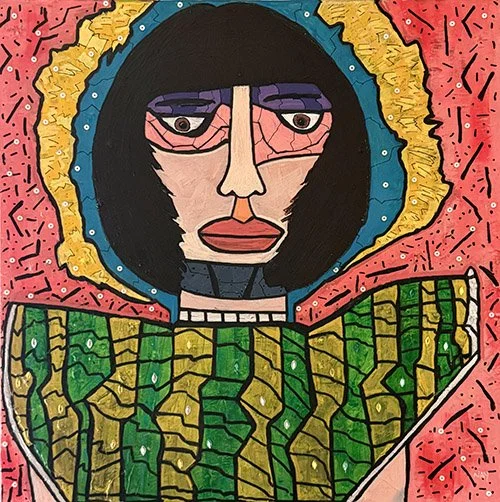 Janet Brugos paints with texture, finding the right example of fabric, string or found object to add to the growing image. Brugos works in themes: Women of the World, Climate Awareness and Urban Landscapes.