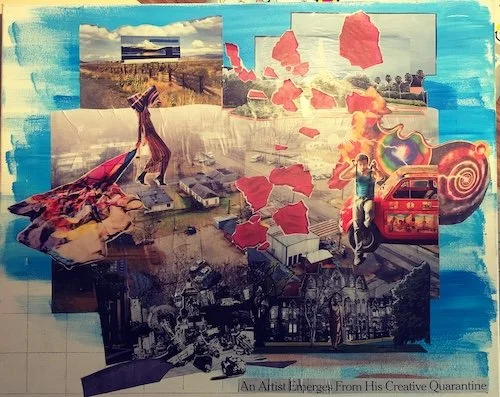 A multidisciplinary artist from a working class background with the heart of an outlaw, pan ellington’s body of work comprises the written word, performance / guerrilla art, photography & experimental film, with the majority of their visual artwork in recent years photomontage, “a type of collage in which the pasted items are actual photographs, or photographic reproductions pulled from the press and other widely produced media,” assembled primarily on found canvases and other material acquired on their daily walks throughout the City of Berkeley, utilizing their own archive of photographic images, clips from newspapers and magazines, material they’ve collected beginning in the late 1990s.