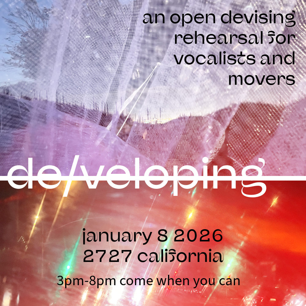 Open rehearsal testing movement and sound components for an upcoming piece. Visitors welcome to join and participate as audience-space interaction is crucial to the success of the piece. We will be moving along paths, herding visitors into shapes, and singing