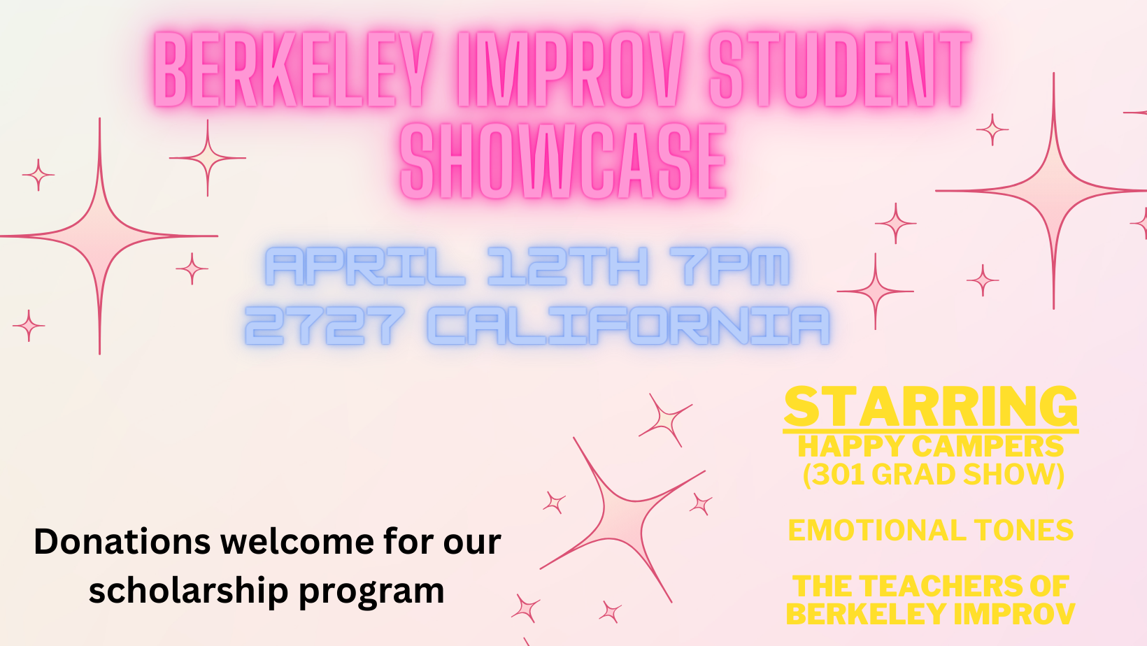 Back to All Events Berkeley Improv Community Showcase Friday, April 12, 2024 7:00 PM 9:00 PM Google Calendar ICS