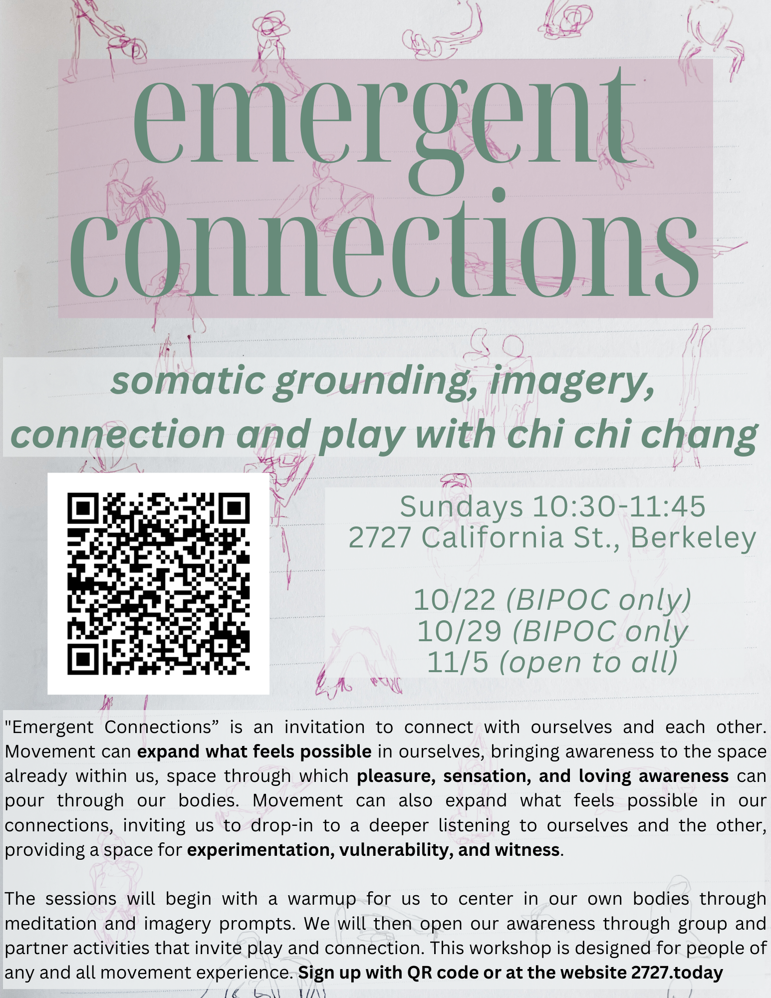 "Emergent Connections” is an invitation to connect with ourselves and each other. Movement can expand what feels possible in ourselves, bringing awareness to the space already within us, space through which pleasure, sensation, and loving awareness can pour through our bodies. Movement can also expand what feels possible in our connections, inviting us to drop-in to a deeper listening to ourselves and the other, providing a space for experimentation, vulnerability, and witness.